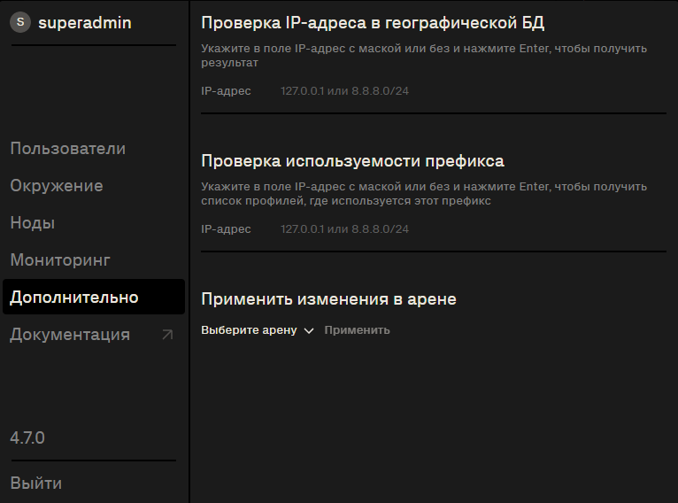 Проверка используемости префикса – отображает список профилей, в которых используется заданный IP-адрес или префикс.