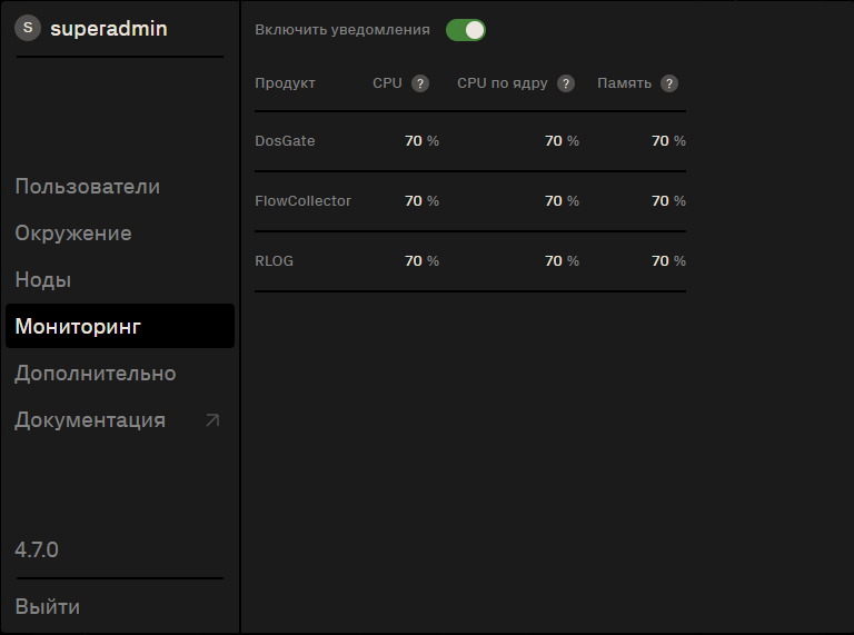 В верхней части расположен переключатель Включить уведомления, который активирует отправку предупреждений при превышении заданных порогов нагрузки.