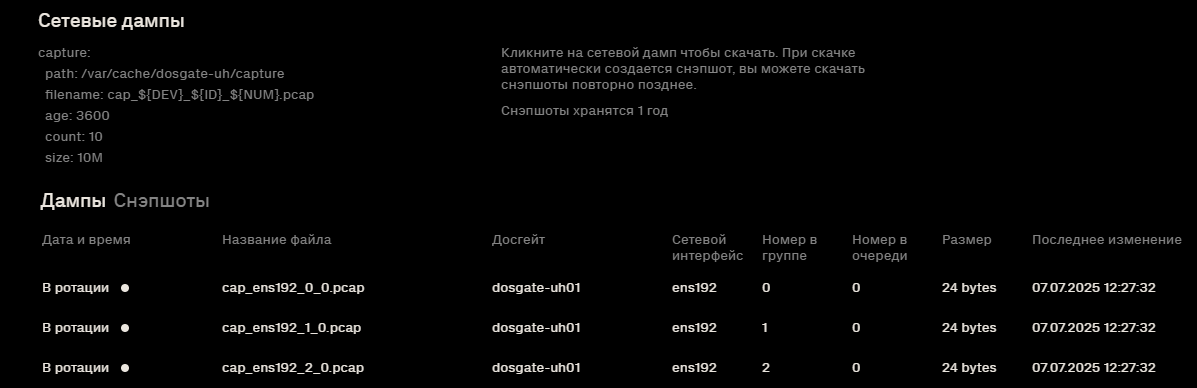Для профиля сессионного модуля доступна функция сохранения и загрузки сетевых дампов. В верхней панели необходимо нажать Сетевые дампы.