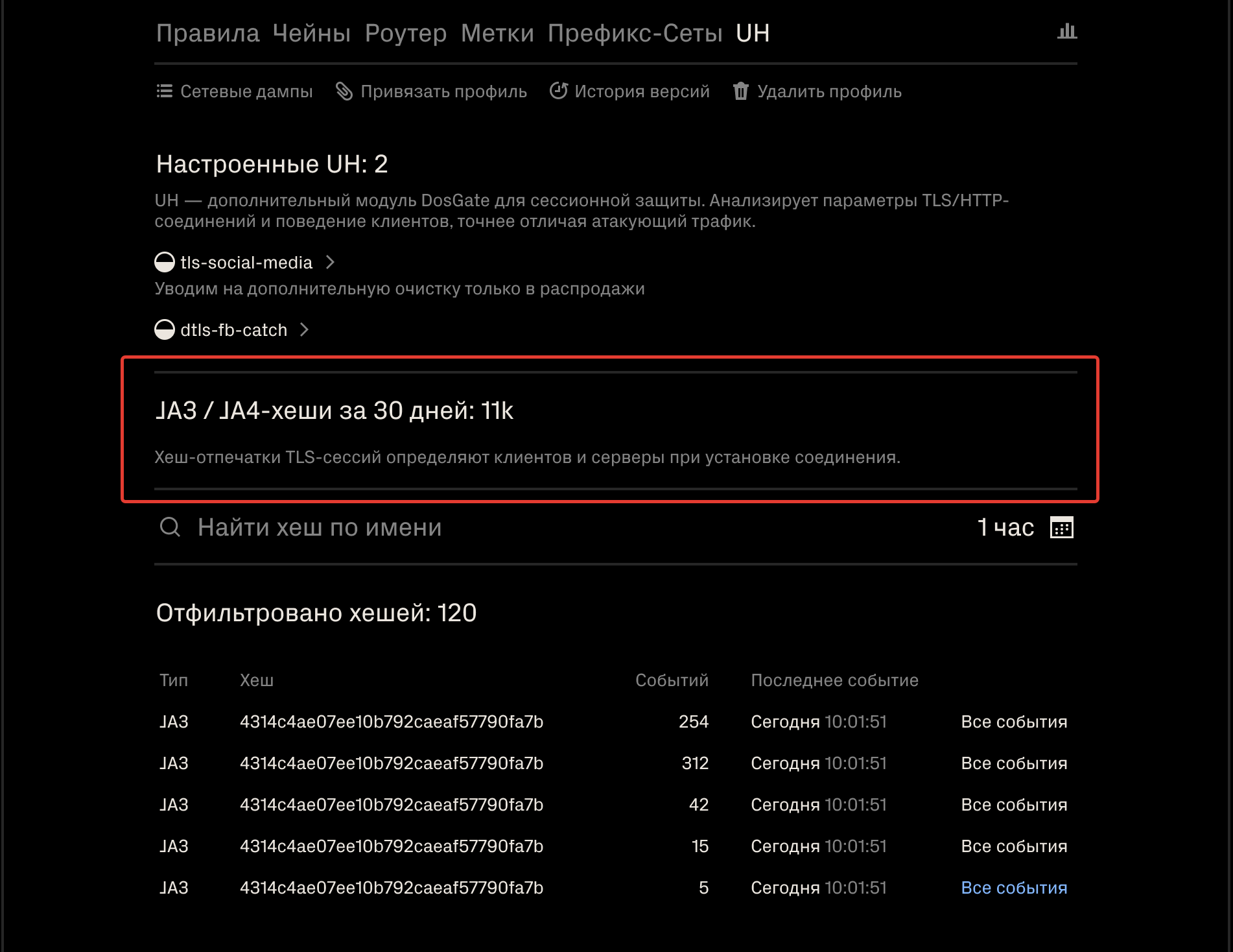 Таблица JA3/JA4-отпечатков в сессионном модуле